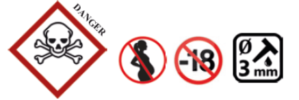 MENTION D’AVERTISSEMENT DANGER : Peut être corrosif pour les métaux. Toxique en cas d’ingestion. Tenir hors de portée des enfants. Produit interdit aux mineurs.